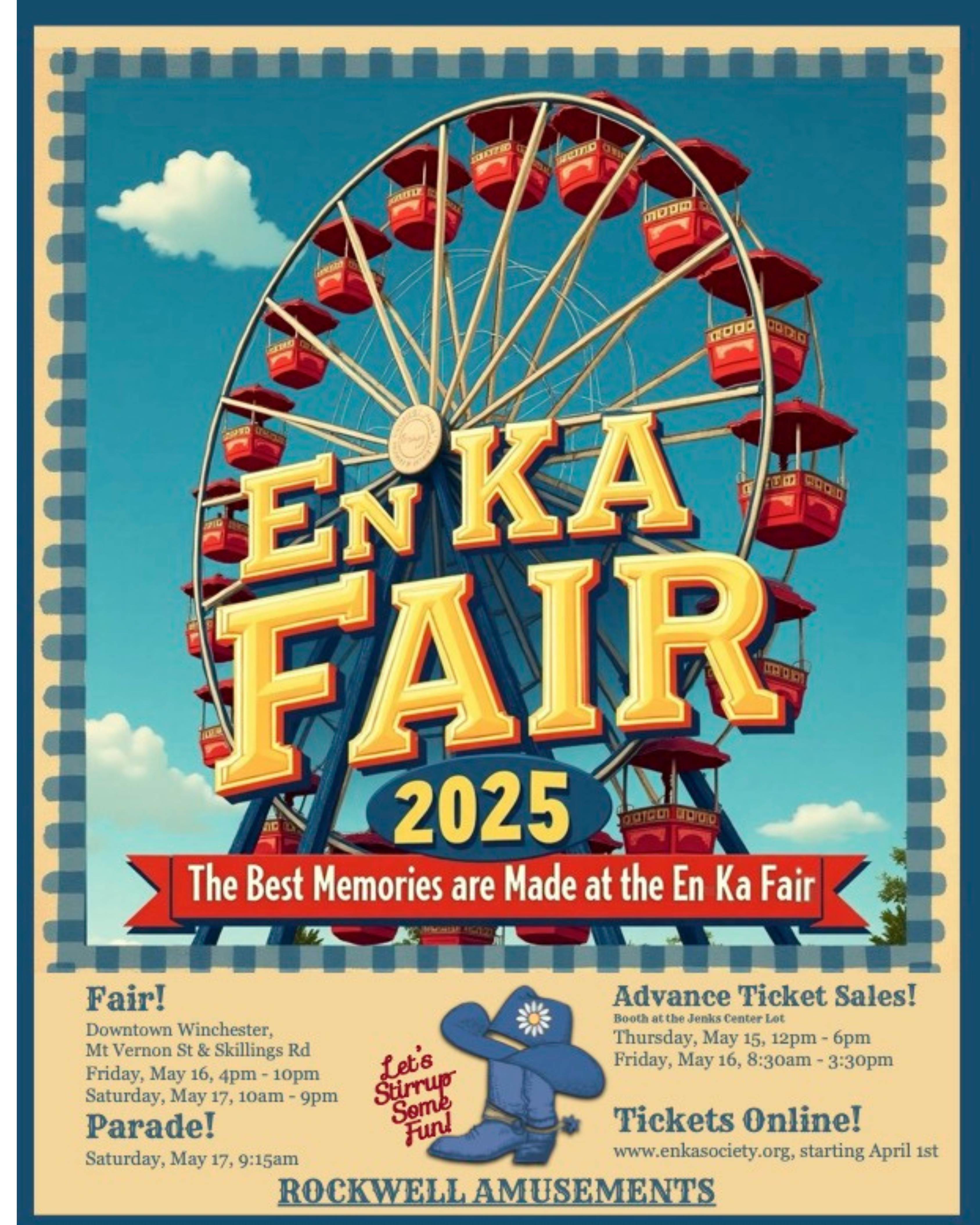 Come on down and join us for the annual En Ka Fair! Held in downtown Winchester/the Jenks Center parking lot.