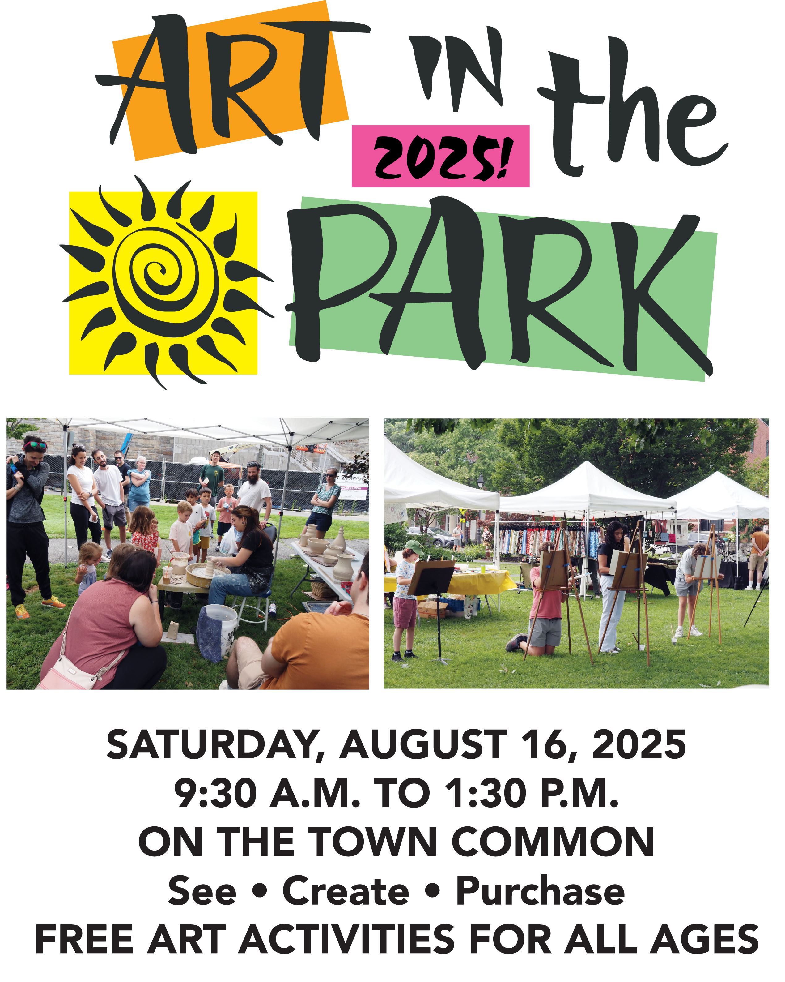 Art in the Park is a public outdoor art activity free and open to the public, with demonstrations, participatory art, and exhibition and sale of works by local artists. The event is held on the Winchester Common on Saturday, August 16, from 9:30 am to 1:30 pm, in conjunction with the weekly Farmers' Market. It is a highlight of the month-long Art in August festival.